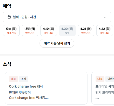 | 실시간 예약 | 날짜, 시간, 인원 설정 후 실시간 예약 가능. 잔여 좌석 자동 표시 |